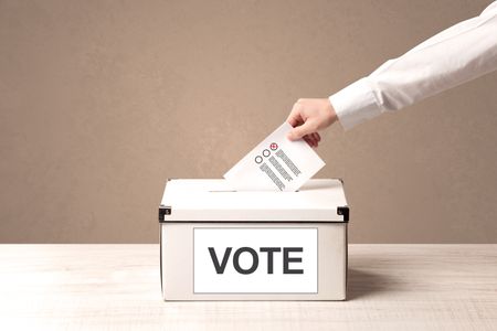 Close up of male hand putting vote into a ballot box, on grungy background