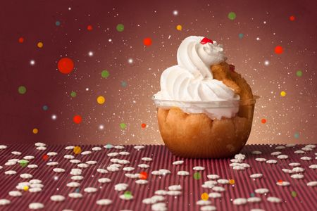 Close up of sweet tasty cakes with colorful background and bokeh light