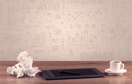 Close up of white business office desk with laptop tablet in front of brown wall background full of pie charts and numbers