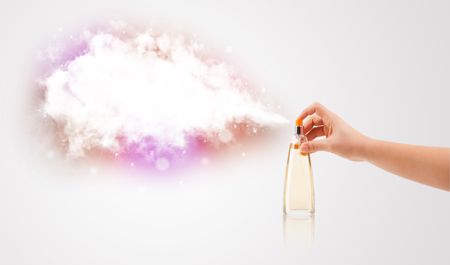 close up of woman hands spraying colorful cloud from beautiful perfume bottle