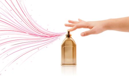 close up of woman hands spraying colorful lines from beautiful perfume bottle
