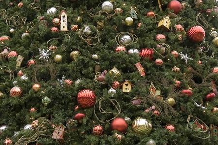 Close-up of huge outdoor Christmas tree with many ornaments