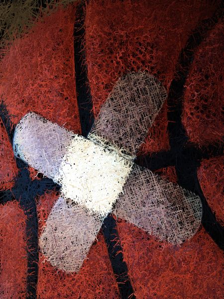 Closeup of two bandages on basketball (stylized version of indoor photo)
