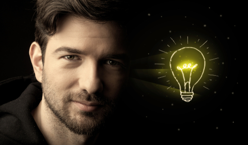 Close-up of young confident man with drawn light bulb