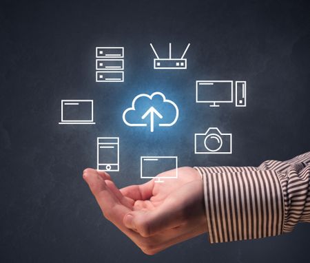 Cloud and computing related icons hovering over young hand