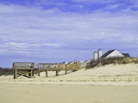 Coastal landscape: Beach view of boardwalk and deck by dune near peaked roofs of houses in Cape Cod, Massachusetts