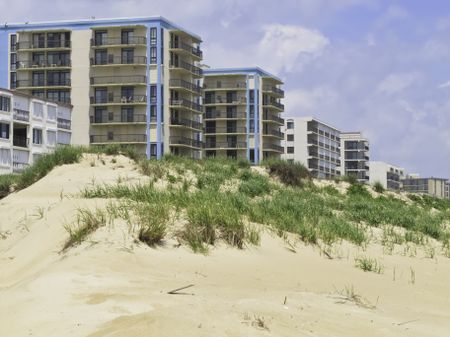 Coastal landscape: Row of high-rises with ocean views by dune along beach in Ocean City, Maryland