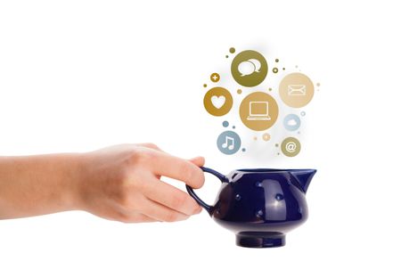 Coffe pot with social and media icons in colorful bubbles, isolated on white