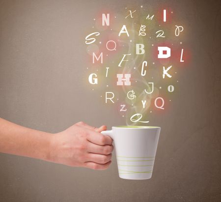 Coffee cup with colorful letters, close up