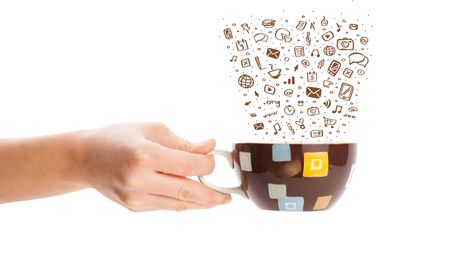 Coffee-mug with hand drawn media icons, isolated on white