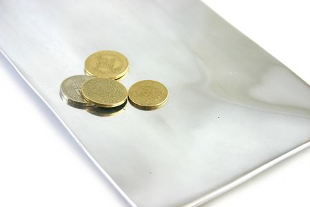 coins on an aluminium tray