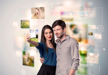 Collecting memories concept with photos in backbround and a happy young couple in love taking selfie with a mobile phone