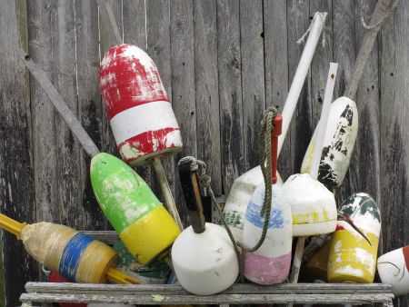 Collection of lobster trap buoys in Cape Cod, Massachusetts