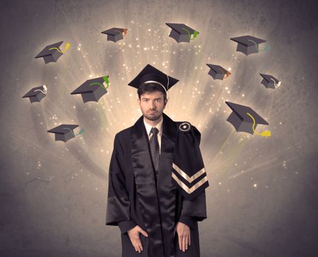 College graduate with many flying hats on grunge background
