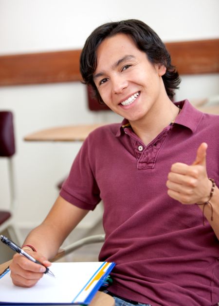 College student in a classroom with thumbs up