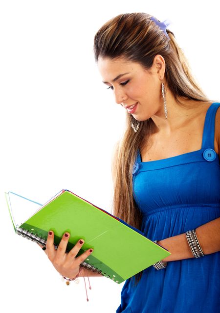 college student reading a green notebook isolated over a white background