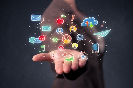 Colorful hand-drawn social media icons in the hands of young casual businesswoman