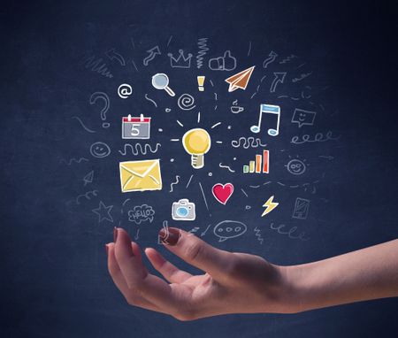 Colorful mixed media icons hovering over young hand