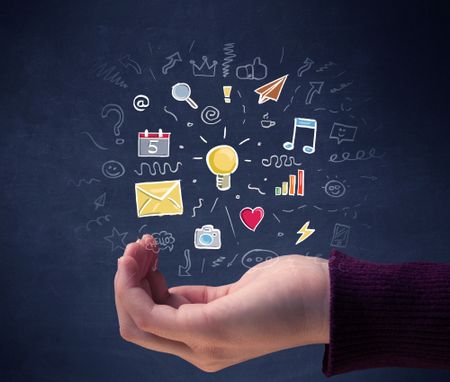 Colorful mixed media icons hovering over young hand