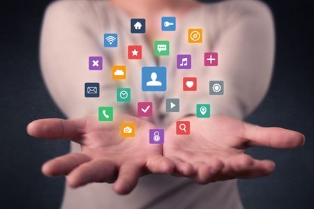 Colorful multimedia icons in the hands of a young casual businesswoman
