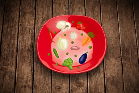 Colorful plate with hand drawn icons, symbols, vegetables and fruits on grungy background