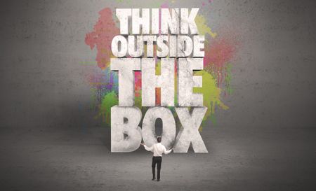 Colorful wall with illustrated quote saying think outside the box for a small businessman standing in grey urban space concept