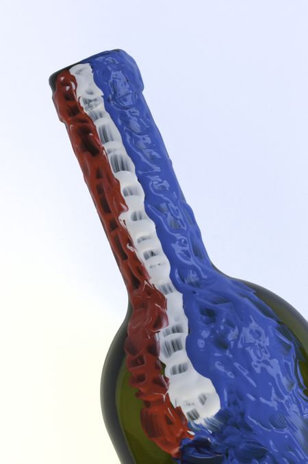 Colors of American flag -- red, white, and blue -- painted on green wine bottle