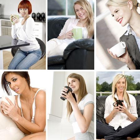 Compilation of beautiful young woman relaxing and taking a coffee break