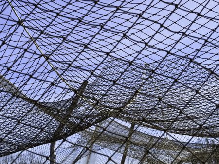 Complexities of practice: Part of netting over batting cage by baseball field on campus of community college