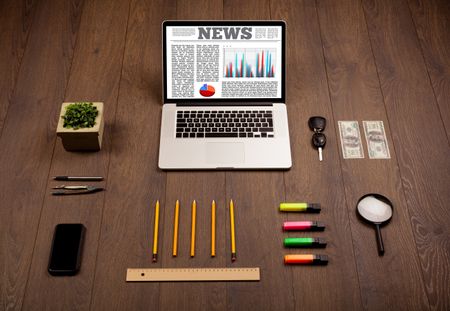 Computer laptop on wooden desk with office accessories
