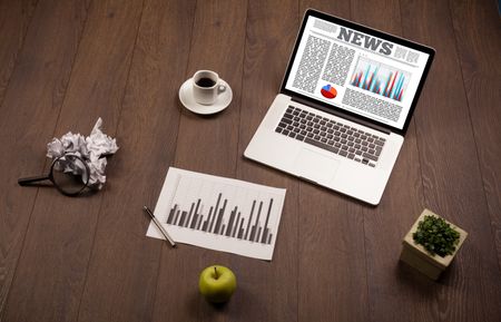 Computer laptop on wooden desk with office accessories