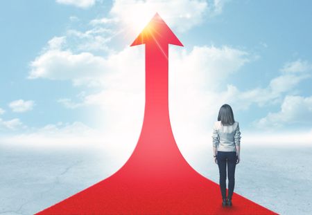 Concept of the road to success with a businesswoman standing on a red arrow