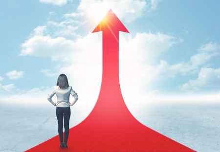 Concept of the road to success with a businesswoman standing on a red arrow