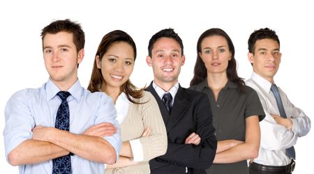 confident business man and his business team - group formed of people from all over the world over a nice blue sky