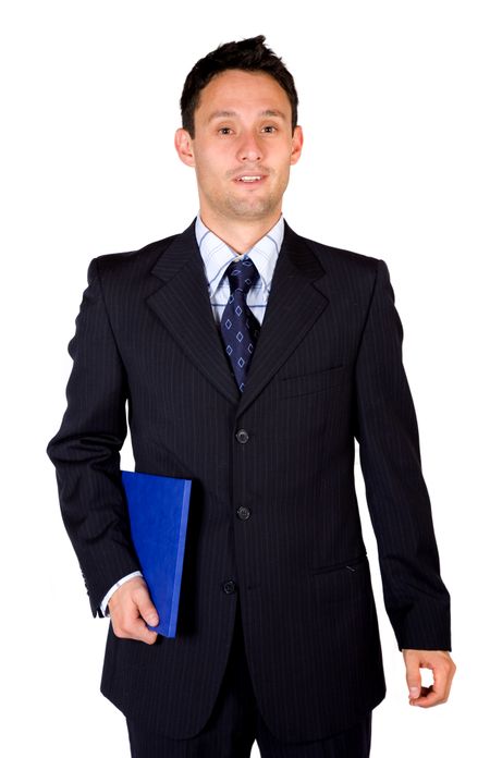 confident business man with a folder over a white background