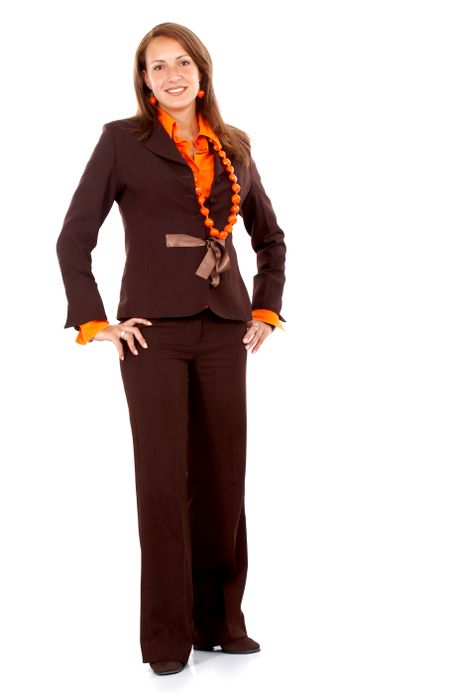 confident business woman standing wearing elegant clothes - isolated over a white background
