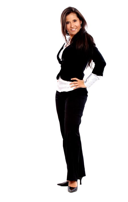 confident business woman standing wearing elegant clothes - isolated over a white background