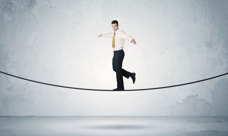 A confident businessman with briefcase walking ahead on a tightrope in empty grey urban space concept