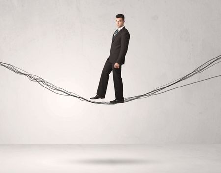 A confident businessman with briefcase walking forward on drawn lines, cables in empty grey space concept