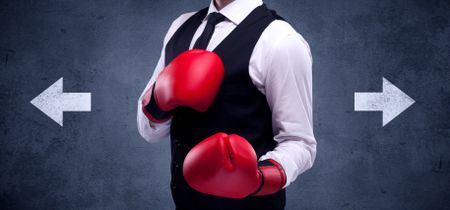 A confident businessman standing with red boxing gloves on his hand in front of arrows pointing in different directions on urban wall background concept.