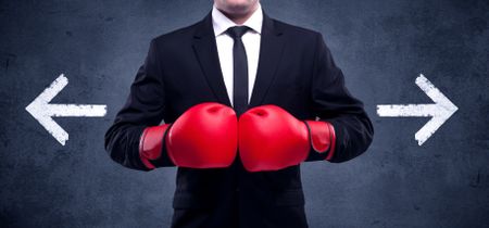 A confident businessman standing with red boxing gloves on his hand in front of arrows pointing in different directions on urban wall background concept.
