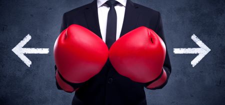 A confident businessman standing with red boxing gloves on his hand in front of arrows pointing in different directions on urban wall background concept.