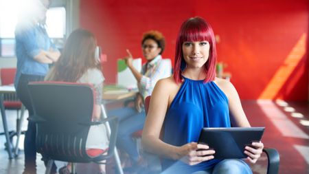 Confident female designer working on a digital tablet in red creative office space