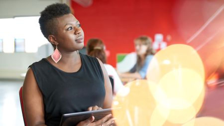 Confident female designer working on a digital tablet in red creative office space