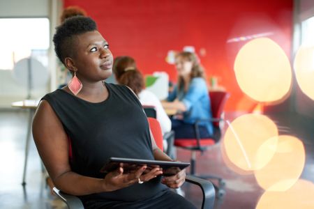 Confident female designer working on a digital tablet in red creative office space
