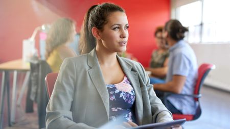 Confident female designer working on a digital tablet in red creative office space