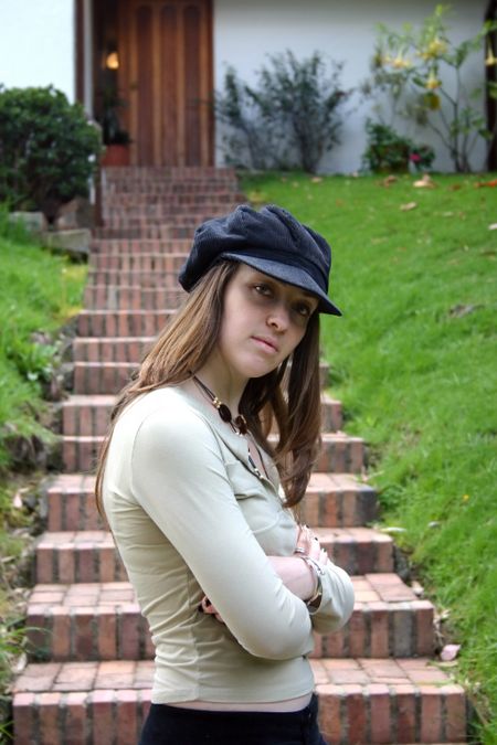 confident female in front of a countryside house