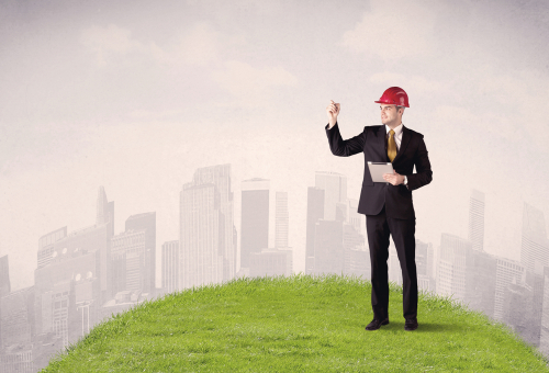 A confident male well looking office manager standing in small green grass in front of city landscape with tall buildings concept.