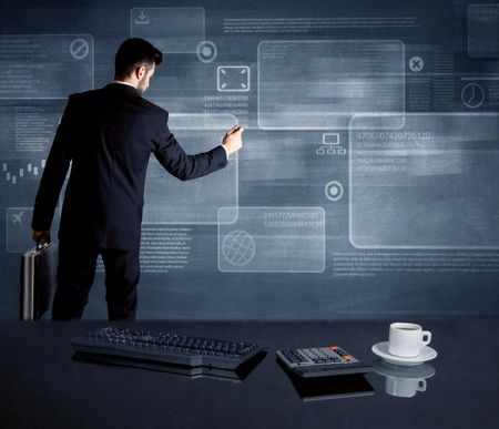 A confident office worker drawing digital chart boxeswith numbers illustration in the middle of a conference meeting concept