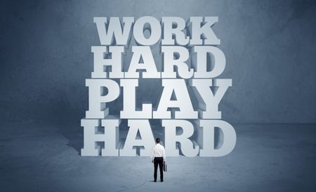 A confident salesman in suit standing in front of illustrated block letters saying work hard play hard concept